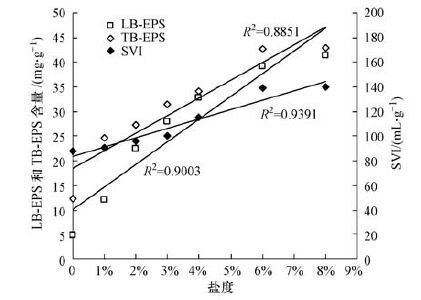 圖 7不同鹽度下LB-EPS、TB-EPS和SVI間的關(guān)系