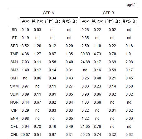 A廠活性污泥中檢出11種目標(biāo)抗生素, 含量在0.01~0.67 μg·g-1之間, 脫水污泥中檢出12種目標(biāo)抗生素, 含量在0.03~1.35 μg·g-1之間(表 2).B廠活性污泥和脫水污泥中均檢出10種目標(biāo)抗生素, 含量分別在0.01~0.69和0.02~2.08 μg·g-1之間(表 2).B廠兩種污泥中抗生素的平均濃度高于A廠.兩廠脫水污泥中抗生素的平均濃度高于活性污泥中的平均濃度.各抗生素含量變化范圍較大, SD、ST未檢出, TMP、SM1、CHL濃度較高.與廣州、香港污水廠脫水污泥中抗生素的含量相比, NOR的濃度偏低, SD、SMT、OFL的濃度與之相當(dāng), SM2、CHL的濃度較高.嚴(yán)清等報道的重慶污水廠活性污泥中TMP的含量為0.01 μg·g-1, SMT的含量為0.02 μg·g-1, 低于本研究所得結(jié)果, NOR、OFL的含量則高于本文.污泥吸附是污水廠中抗生素的去除機(jī)制之一, 受藥物自身及污泥理化性質(zhì)影響, 并不適用于所有種類的抗生素.且此機(jī)制只是將液相中的抗生素物質(zhì)轉(zhuǎn)移到固相介質(zhì)中, 并不能減少環(huán)境排放量, 還可能進(jìn)一步增加去除難度.通過吸附能否有效固定抗生素, 也有待進(jìn)一步研究.
