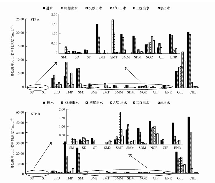 3.2 污水處理單元中抗生素的分布