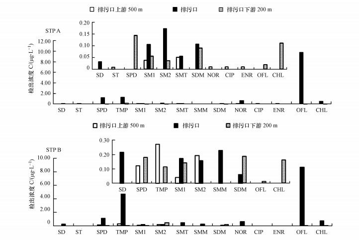 3.5 受納水體中抗生素含量水平及潛在風(fēng)險評價3.5.1 受納水體中目標(biāo)抗生素的濃度