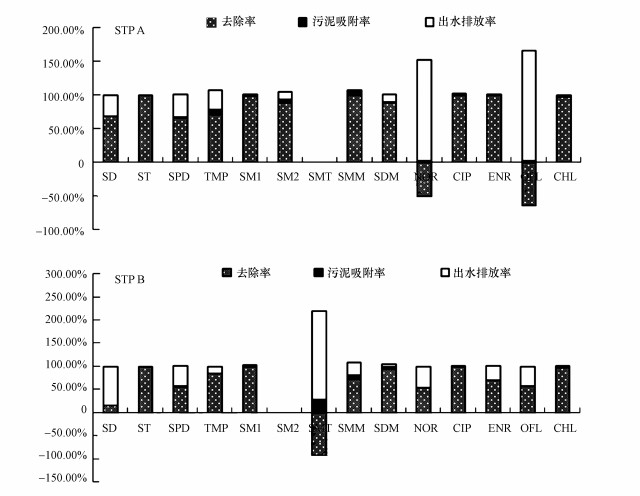 利用質(zhì)量平衡分析法分析抗生素在污水處理廠中的潛在去除機(jī)制.目標(biāo)抗生素在A、B兩廠進(jìn)水中的總?cè)召|(zhì)量負(fù)荷分別為8330.88、25184.38 g·d-1; 出水中的總?cè)召|(zhì)量負(fù)荷分別為2502.93、3094.19 g·d-1; 污泥中的總?cè)召|(zhì)量負(fù)荷分別為176.85、153.62 g·d-1.污泥吸附分別占進(jìn)水總負(fù)荷的2.1%、0.6%.Gao等(認(rèn)為抗生素等藥物在污水處理過程中主要通過生物轉(zhuǎn)化/降解、吸附和揮發(fā)去除, 多數(shù)PPCPs類物質(zhì)的亨利系數(shù)非常低, 揮發(fā)作用可以忽略.因此, 可以假定其主要去除機(jī)制為生物轉(zhuǎn)化/降解和吸附.本研究中, 多數(shù)抗生素經(jīng)過沉砂池(初沉池)處理后, 濃度下降明顯, 而沉砂池(初沉池)生物量不高, 故其去除應(yīng)該是吸附在顆粒物表面, 隨顆粒物沉降所致.活性污泥中抗生素的總?cè)召|(zhì)量負(fù)荷僅為進(jìn)水總負(fù)荷的2.1%、0.6%, 所占比例不高, 可以推測二級處理的主要去除機(jī)制是生物轉(zhuǎn)化和降解.選擇A、B兩廠進(jìn)水中檢出的抗生素, 以其不同途徑去除率為基礎(chǔ)作圖(圖 4), 可以看出, A廠TMP、SMM和B廠SMT、SMM在污泥中的含量相對較高, 剩余物質(zhì)均在污泥中負(fù)荷較低, 兩廠SD、ST以及B廠NOR、OFL的污泥吸附率為0, 表明生物作用對去除起主要影響.NOR、OFL屬于氟喹諾酮類抗生素(FQs), 通常認(rèn)為容易吸附到固相介質(zhì)中, 實驗所測污泥中的含量并不高.Li等(2004)認(rèn)為污泥對氟喹諾酮類抗生素的吸附主要受靜電引力作用, Ca2+和Mg2+等濃度較高, 會明顯降低FQs在活性污泥上的吸附.蘭州地區(qū)廢水中含鹽量通常較高, 容易通過競爭吸附抑制FQs的吸附, 導(dǎo)致污泥中NOR、OFL的含量降低.另一方面, 不同活性污泥法的微生物群落不同, 所選污水廠的活性污泥中可能產(chǎn)生了某些降解FQs的微生物細(xì)菌, 分解了污泥中的部分FQs.