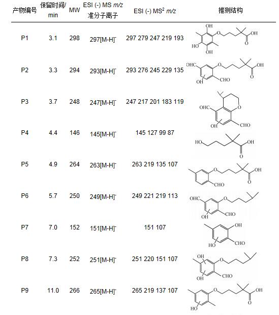 表 2 GEM降解產(chǎn)物的質(zhì)譜碎片信息和推測的結(jié)構(gòu)