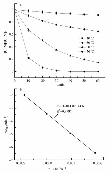 溫度在熱活化過硫酸鹽體系降解污染物的過程當(dāng)中也起著至關(guān)重要的作用.本研究考察40~70 ℃之間GEM的降解情況, 結(jié)果如圖 2a所示.GEM的降解速率常數(shù)kobs隨溫度的升高而顯著增加.40 ℃時, GEM的kobs為0.00156 min-1, 而當(dāng)溫度升高到70 ℃時, kobs增加到0.1356 min-1, 幾乎增長了87倍.Ji等在用熱活化過硫酸鹽技術(shù)降解Atrazine時, 也發(fā)現(xiàn)溫度從30 ℃升高到60 ℃時, kobs增長了114倍.隨著反應(yīng)溶液溫度的升高, 過硫酸鹽的分解速度加快, 反應(yīng)液中自由基濃度增加, 從而使GEM的降解速率增加.此外, 根據(jù)熱力學(xué)原理, 隨著反應(yīng)溫度的升高, kobs也會隨之升高.反應(yīng)溫度T和kobs兩者之間的關(guān)系遵循阿侖尼烏斯方程: