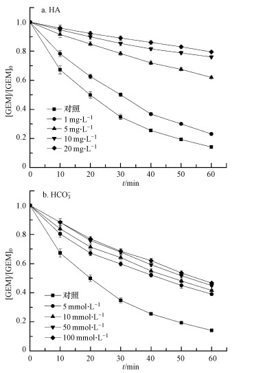 本研究著重考察了HA和HCO3-對GEM降解的影響.HA由于分子結(jié)構(gòu)中的富電子基團(tuán)容易被SO4·-和HO·等親電自由基攻擊, 從而扮演者自由基清除劑的角色, 其對GEM降解的影響如圖 4a所示.從圖中可知, HA的加入明顯抑制了GEM的降解, 而且抑制程度隨HA濃度的增加而增強(qiáng).未添加HA時, 60 min內(nèi)GEM可以達(dá)到86%的去除率, 而當(dāng)加入的HA增大到20 mg·L-1HA時, GEM的去除率降到了20%.這正是因?yàn)镠A分子中的羥基、氨基等富電子活性基團(tuán)和GEM競爭溶液中的SO4·-和HO·等氧化物種, 并最終抑制了GEM的降解.