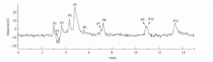 GEM在負(fù)離子檢測模式下降解產(chǎn)物的總離子流色譜圖(TIC)如圖 6所示.從圖中可知, 共檢測到11種中間產(chǎn)物, 它們分別用P1~P11表示.根據(jù)總離子流色譜圖和降解產(chǎn)物的二級質(zhì)譜圖信息, 可以推測降解產(chǎn)物的主要結(jié)構(gòu).GEM降解產(chǎn)物的質(zhì)譜碎片信息以及推測的可能結(jié)構(gòu)列于表 2.從表中可知, P1和P9是GEM苯環(huán)羥基加成后的產(chǎn)物;P5是苯環(huán)甲基被氧化為醛基的產(chǎn)物;P2則是苯環(huán)的羥基化和醛基化的產(chǎn)物;P6和P8是羥基化和醛基化的GEM側(cè)鏈脫去羧基后的產(chǎn)物;P3則是苯環(huán)先經(jīng)歷羥基化和醛基化反應(yīng), 通過環(huán)化作用脫去兩個氫后, 再脫去羧基后的產(chǎn)物;P4、P7、P10和P11都是苯環(huán)醚支鏈斷裂的產(chǎn)物.
