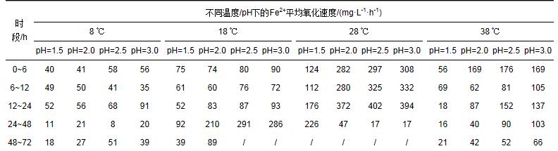 當(dāng)溫度只有8 ℃時(shí), 所有處理中Fe2+的氧化速度都很慢, 反應(yīng)72 h時(shí), Fe2+最高氧化率只有34.02%, 不同處理之間差異較小, 說明相對(duì)于pH而言, 溫度對(duì)A.ferrooxidans的影響作用更明顯.另外, 表 1中也沒有觀察到Fe2+加速氧化的現(xiàn)象, 不同時(shí)段Fe2+平均氧化速度基本在40~90 mg·L-1·h-1之間, 說明8 ℃下不利于A.ferrooxidans的生長(zhǎng)繁殖.