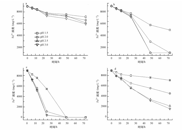 1) 溫度和pH均影響Fe2+生物氧化和Fe3+水解成礦.A.ferrooxidans在28 ℃時(shí)生長(zhǎng)最為適宜, 18 ℃次之, 而10 ℃和38 ℃則都不利于細(xì)菌生長(zhǎng)繁殖, 導(dǎo)致Fe2+氧化速度明顯變慢.pH=2.0~3.0對(duì)A.ferrooxidans的氧化活性沒有明顯影響, 而pH=1.5對(duì)其有顯著的抑制作用.