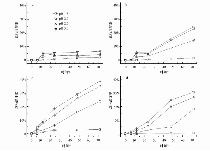當(dāng)反應(yīng)溫度為8 ℃時(shí)(圖 2a), 通過觀察發(fā)現(xiàn), 只有pH=3.0處理中出現(xiàn)渾濁, 有少量沉淀生成, 計(jì)算總Fe沉淀率為6.50%;而其它處理中則液體澄清, 瓶壁干凈, 沒有明顯的固相生成.究其原因有兩個(gè):一是低溫不利于細(xì)菌氧化Fe2+(圖 1a和表 1), 從而導(dǎo)致體系中的Fe3+濃度低, 繼而不利于次生礦物的形成;另外一個(gè)就是次生礦物的形成是一個(gè)吸熱反應(yīng), 所以溫度低不利于Fe3+水解反應(yīng)的進(jìn)行.當(dāng)溫度提高到18 ℃時(shí)(圖 2b), 除了起始pH=1.5處理外, 其它反應(yīng)體系中均有沉淀生成, 且反應(yīng)24 h后總Fe沉淀率呈直線上升趨勢(shì), 結(jié)合表 1可以推測(cè), Fe2+氧化速度的加快(24~48 h)促進(jìn)體系Fe3+濃度的提高有利于次生礦物的生成.總體來說, 起始pH越高, 越有利于除去溶液中的可溶性鐵.當(dāng)溫度提高到28 ℃時(shí)(圖 2c), 除pH=1.5處理外, 所有處理中總Fe沉淀率從反應(yīng)啟動(dòng)時(shí)就開始直線上升, 生成大量次生鐵礦物, 反應(yīng)72 h后, pH=2.0、2.5、3.0時(shí)總Fe沉淀率分別達(dá)到23.75%、34.92%、38.85%.當(dāng)溫度為38 ℃時(shí)(圖 2d), 較高pH處理也能保證一定的總Fe沉淀率.通過與18 ℃條件下的結(jié)果相比較發(fā)現(xiàn), 雖然溫度升高不利于A.ferrooxidans對(duì)Fe2+充分氧化, 但卻能夠顯著促進(jìn)次生鐵礦物的生成.說明高溫促進(jìn)了Fe3+的水解, 吸熱效應(yīng)促使次生鐵礦物的形成反應(yīng)平衡向右移動(dòng).