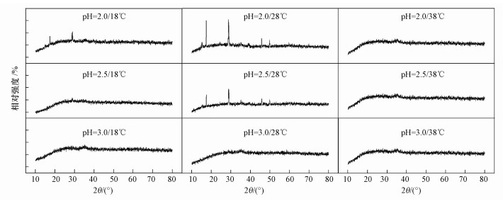 圖 3為改良9K培養(yǎng)基中培養(yǎng)72 h時(shí)收集得到的次生鐵礦物XRD譜.顯然, 溫度和起始pH對(duì)體系次生鐵礦物的種類都有一定的影響.在18 ℃環(huán)境下, 起始pH=2.5和pH=3.0處理收集的次生鐵礦物應(yīng)為同一物質(zhì), 根據(jù)其衍射峰位置及相對(duì)強(qiáng)度, 分析礦物為一種無定型的施威特曼石.而起始pH=2.0時(shí), 次生礦物開始出現(xiàn)微弱的黃鐵礬衍射峰.柏雙友等研究結(jié)果表明, Fe3+供應(yīng)速度的提高是促進(jìn)次生礦物相向黃鐵礬轉(zhuǎn)變的主要原因, 在相同條件下, 80 mmol·L-1 Fe2+時(shí)產(chǎn)物為純凈的施氏礦物, 而80 mmol·L-1 Fe2++10 mmol·L-1 Fe3+時(shí)主要產(chǎn)物為黃鐵礬.而結(jié)合圖 1可以發(fā)現(xiàn), pH=2.0時(shí)Fe2+氧化速度不及pH=2.5~3.0, 這也間接說明促使黃鐵礬生成的因素不僅僅局限于Fe2+氧化速度, 與體系pH也密切相關(guān).當(dāng)溫度上升至28 ℃時(shí), 起始pH=3.0時(shí)收集到的礦物為單一施威特曼石, 而在pH=2.0~2.5范圍內(nèi), pH降低有利于黃鐵礬的生成, 且pH越低, 表征的衍射峰越強(qiáng), 這與Liao等研究結(jié)果一致.此外發(fā)現(xiàn), 不同pH處理在38 ℃時(shí)獲得礦物相均為無定型的施威特曼石, 結(jié)合圖 1可以判斷, 較低的Fe3+供應(yīng)速度是導(dǎo)致此溫度下次生礦物相為施威特曼石的主要原因.Kupka等研究表明, 在5 ℃環(huán)境下培養(yǎng)17 d后生成的礦物以施威特曼石為主, 并含有少量的黃鉀鐵礬, 而在30 ℃時(shí)則相反.因本研究培養(yǎng)時(shí)間只有3 d, 故在低溫時(shí)并未收集到任何礦物相的次生產(chǎn)物, 但從溫度18~28 ℃、pH=2.0~2.5時(shí)的培養(yǎng)結(jié)果來看, 與上述學(xué)者結(jié)論并不矛盾.Wang等報(bào)道, 溫度的升高有利于施威特曼石向黃鉀鐵礬轉(zhuǎn)變, 這在圖 3中也有所體現(xiàn), 但前提是溫度不能過于極端, 且要保證培養(yǎng)體系起始pH在一定范圍內(nèi).