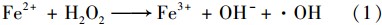 圖 3(d)顯示了Fe2+濃度對光電Fenton技術(shù)處理污泥脫水液過程中COD去除率的影響. 當(dāng)溶液中沒有Fe2+存在時,僅獲得一個較低的COD去除率. 說明單獨在UV作用下,H2 O2分解產(chǎn)生 ·OH的速率較低. 當(dāng)投加FeSO4后,COD去除率有明顯的提高. H2 O2在Fe2+作用下,快速產(chǎn)生 ·OH,污泥脫水液中的有機物被快速地氧化分解,因而COD去除率提高. 盡管提高Fe2+濃度可以提高COD去除效果,但Fe2+同時也被 ·OH氧化. 另外,大量產(chǎn)生的 ·OH將和H2 O2反應(yīng)消耗H2 O2[式(10)]. 同時,由于Fe2+濃度的增加,溶液的透明度降低,UV的促進作用受到影響,反應(yīng)(1)、 (3)、 (4)受到抑制. 再者,隨著Fe2+濃度的增加也會形成二次污染問題. 根據(jù)圖 3(d),F(xiàn)e2+的最佳濃度為6.53 mmol ·L-1.