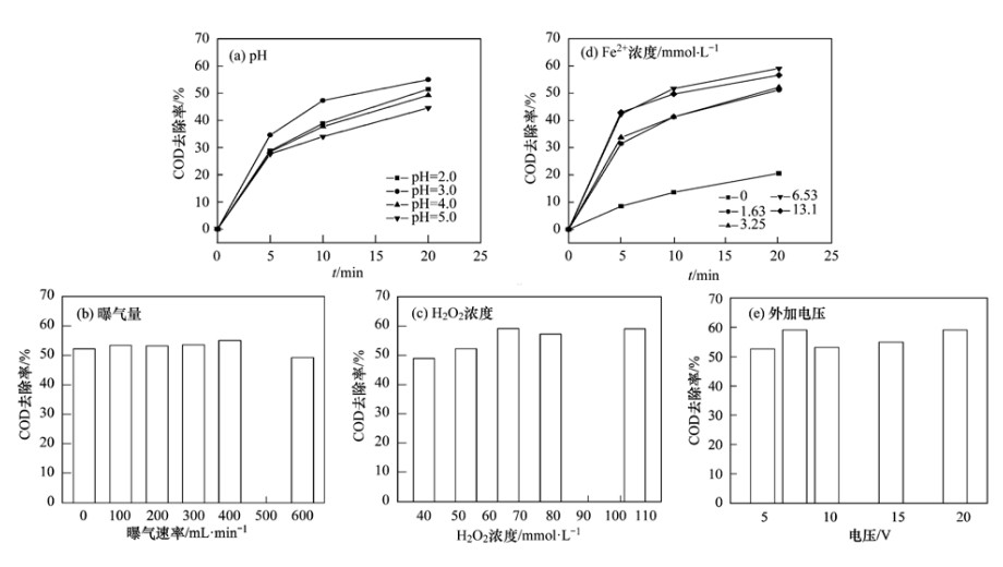 圖 3 pH值、 曝氣量、 H2 O2濃度、 Fe2+濃度、 外加電壓對COD去除率的影響