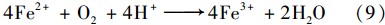 圖 3(b)顯示了曝氣速率對COD去除率的影響. 對于光電Fenton過程,溶解氧可以從陰極得電子生成H2 O2[式(5)],因此溶解氧濃度會影響反應(yīng)過程中H2 O2的產(chǎn)量. 在光電Fenton過程中,溶解氧主要通過兩種方式提供,曝氣以及陽極反應(yīng)[式(8)]. 隨著溶解氧濃度的升高,H2 O2的產(chǎn)量也會增加. 盡管增加曝氣量可以增加溶解氧濃度,但曝氣同時也會加速H2 O2的分解生成水,而這對于利用H2 O2產(chǎn)生 ·OH降解有機物是不利的. 另外當(dāng)溶解氧濃度較高時,F(xiàn)e2+易被氧化成Fe3+[式(9)],這也會影響 ·OH的產(chǎn)生,進而影響廢水處理效果. 由圖 3(b)可以看出,曝氣對光電Fenton處理污泥脫水液COD去除率影響較小,因此在后續(xù)試驗中停止曝氣.