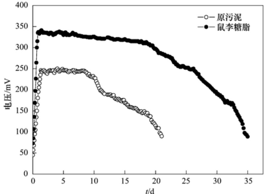 分別記錄對(duì)照組和實(shí)驗(yàn)組運(yùn)行一周期內(nèi)電壓變化. 如圖 1所示, 未投加鼠李糖脂的對(duì)照組, SSMFC經(jīng)1.5 d運(yùn)行后電壓迅速上升到250 mV后基本穩(wěn)定, 持續(xù)運(yùn)行9 d后再緩慢下降至周期結(jié)束, 整個(gè)周期持續(xù)20 d. 而實(shí)驗(yàn)組, SSMFC經(jīng)0.8 d運(yùn)行后電壓迅速上升到335 mV,而后穩(wěn)定運(yùn)行20 d, 再緩慢下降到100 mV以下, 整個(gè)周期持續(xù)運(yùn)行35 d. 系統(tǒng)穩(wěn)定運(yùn)行時(shí), 實(shí)驗(yàn)組較對(duì)照組SSMFC輸出電壓要高85 mV左右, 持續(xù)運(yùn)行周期要長(zhǎng)15 d左右. 因此, 采用鼠李糖脂強(qiáng)化污泥水解可以提高SSMFC的輸出電壓, 延長(zhǎng)系統(tǒng)運(yùn)行周期.