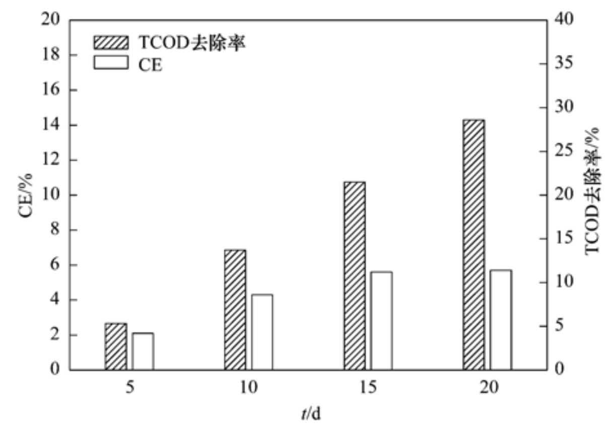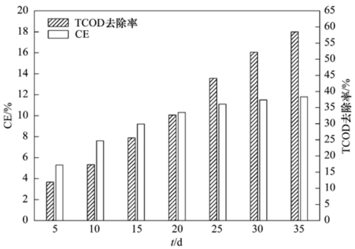 圖 3 原污泥SSMFC TCOD去除率,CE隨運(yùn)行時(shí)間變化