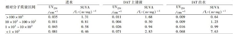 由圖 5可以看出,進水UV254含量在相對分子質(zhì)量<1×103的區(qū)間內(nèi)最高,占總 UV254 的 47.31%,其次是中間分子量(1×103~100×103)的有機物,這與TOC分布基本一致,說明進水中芳香性或具有雙鍵物質(zhì)主要集中在中小分子段. 在分子量<1×103的區(qū)間內(nèi)DAT上清液和IAT出水中UV254含量分別增大到63.51%和66.57%. 同時,由表2可見在該區(qū)間,進水、 DAT上清液及IAT出水的SUVA也急劇增大,從進水中的0.46增加到DAT上清液中的2.83,再到IAT出水中的7.63. 根據(jù)Edzwald[6]的分類標準,當 SUVA 值介于 4~5之間時,水中的溶解性有機物主要是富里酸和腐殖酸,具有較多的芳香族化合物構(gòu)造和較強的疏水性; 當 SUVA 值小于3時,水中的溶解性有機物相對而言是親水性的,芳香族化合物構(gòu)造也較少. 說明在本試驗中,伴隨處理工藝流程,分子量<1×103區(qū)間的物質(zhì)發(fā)生了改變,腐殖質(zhì)類物質(zhì)含量上升,這也是導(dǎo)致污水整體芳香性上升的原因. 也就是說,在同樣TOC去除水平下,如果選擇對IAT出水中分子量<1×103的有機物進行去除,能更有效地減少氯化消毒的風險.