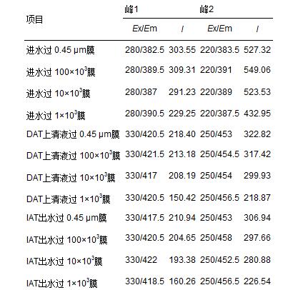 污水在試驗裝置處理過程中,<1×103的小分子量有機物逐漸減少,最終在IAT出水中的含量僅為19.10%. 雖然>100×103的大分子量有機物絕對量有所下降,但其占DOM的百分比從進水中的9.11%增加到IAT出水中的30.69%. 中間分子量(1×103~100×103)的有機物也呈現(xiàn)增長趨勢,在整個處理過程中從30.94%增加到50.21%. 整體看來,污水在A/DAT-IAT工藝生物處理過程中,DOM的分布呈現(xiàn)出由低分子量向高分子量轉(zhuǎn)化的趨勢. 污水生物降解過程中,有機物由低分子量向高分子量轉(zhuǎn)化的現(xiàn)象,曾經(jīng)被文獻[16]所報道. 這可能是由于活性污泥中的微生物利用小分子量有機物,進行新陳代謝,過程中產(chǎn)生胞外聚合物(extracellular polymeric substances,EPS)及溶解性微生物產(chǎn)物(soluble microbial products,SMP),它們的組成除了糖類和蛋白質(zhì),還有核酸、 脫落的細胞表面物質(zhì)、 細胞自溶物等大、 中分子物質(zhì). 而污水中原有的大分子物質(zhì)可能被細胞吸附并被胞外酶水解,但被利用的量有限. 同時小分子量部分被快速利用,更突出了大分子量部分的比例. 而中間分子量物質(zhì)在溶液中的積累說明代謝吸收這部分,而不是水解高分子物質(zhì)和直接利用小分子物質(zhì),可能是活性污泥過程的限速步驟[14]. 更具體的原因需要進一步研究,如單獨對各段分子量有機物進行生物處理后再對DOM的分布進行分析.