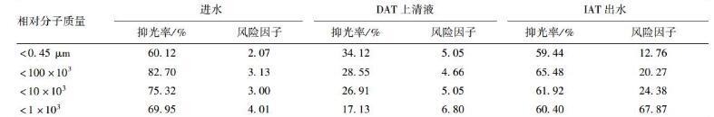 同樣,對IAT出水分級分離后進行分析,發(fā)現(xiàn)各樣品毒性變化不大,結(jié)合TOC分布(圖 3),以抑光率與TOC的比值作為風險性的指標(表4),可以發(fā)現(xiàn),進水與DAT上清液的風險均較小,而IAT出水各部分風險均顯著增大,尤其是分子量<1×103的部分,風險因子高達67.87. 較IAT出水及DAT上清液中的該部分物質(zhì),風險因子顯著增大,一方面,可能是膜的逐級過濾將污水出水中的大分子無毒物質(zhì)去除,增加了小分子物質(zhì)與發(fā)光菌的接觸,即增加了生物可利用性; 另一方面,在分子量<1×103區(qū)間內(nèi),進水、 DAT上清液和IAT出水的抑光率數(shù)據(jù)也說明在IAT池中間歇曝氣處理,確實產(chǎn)生了毒性較高的小分子物質(zhì). 這與Aviani等[33]尋找橄欖油廠廢水毒性的來源的試驗中,發(fā)現(xiàn)經(jīng)白腐真菌處理后殘余的毒性主要是來源于未降解的小分子物質(zhì)而不是原水中大分子物質(zhì)降解產(chǎn)生的小分子物質(zhì)的結(jié)論正好相反,這可能與污水來源不同有關(guān).