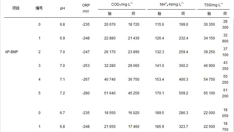 表3 BMP實(shí)驗(yàn)?zāi)┢诓煌現(xiàn)/M條件下主要水質(zhì)