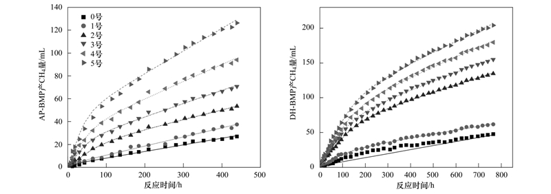 AP-BMP、 DH-BMP批次實(shí)驗(yàn)持續(xù)時(shí)間分別為439 h、 765 h,6組不同的投配比設(shè)計(jì)累積產(chǎn)氣量存在著明顯的差異.實(shí)驗(yàn)初期累積產(chǎn)氣量差異不明顯(圖1),后期逐步增大.兩組實(shí)驗(yàn)氣體成分均以CH4(80%)、 CO2(20%)為主,同時(shí)存在少量的H2(不足1%).實(shí)驗(yàn)產(chǎn)氣均勻,可分為兩個(gè)階段.第一階段產(chǎn)氣速率大,產(chǎn)甲烷菌利用溶解性COD或易水解性物質(zhì)進(jìn)行厭氧發(fā)酵; 之后產(chǎn)氣速率逐漸降低至穩(wěn)定水平,該階段的限速步驟為剩余污泥的水解過程,產(chǎn)氣隨著水解的進(jìn)程而穩(wěn)定增加.至該實(shí)驗(yàn)結(jié)束時(shí),每天仍有穩(wěn)定體積的氣體產(chǎn)生,表明微生物的水解、 厭氧產(chǎn)CH4仍在進(jìn)行中.應(yīng)用改進(jìn)的Gompertz模型對(duì)AP-BMP、 DH-BMP產(chǎn)氣進(jìn)行回歸后的參數(shù)如表2所示.兩廠的厭氧污泥產(chǎn)氣數(shù)據(jù)與改進(jìn)的Gompertz模型擬合較好(R2>0.99).通常厭氧消化過程中的限速步驟為水解破壁過程[21, 22],在無添加外來基質(zhì)的0號(hào)樣品中,AP、 DH厭氧污泥的遲滯期分別為20.00 h、 12.93 h,表明DH厭氧污泥的活性較高.
