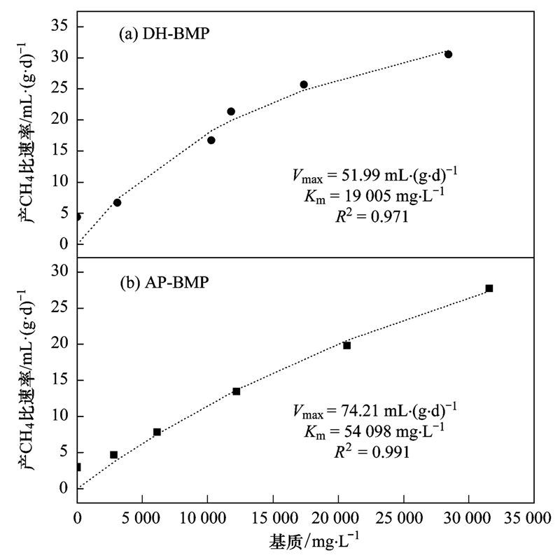 采樣Michaelis-Menten模型對(duì)兩個(gè)批次實(shí)驗(yàn)的基質(zhì)濃度、 比產(chǎn)氣速率回歸后的結(jié)果如圖2所示(R2>0.99).AP、 DH厭氧污泥的最大比產(chǎn)氣速率差距不大,分別為74.21、 51.99 mL ·(g ·d)-1,但兩廠厭氧污泥的Km存在著顯著的差異,DH厭氧污泥的Km為19 005 mg ·L-1而AP厭氧污泥的Km高達(dá)54 098 mg ·L-1.Km是表征底物親和力的常數(shù),表明AP厭氧污泥對(duì)該廠剩余污泥的適應(yīng)性差,需要在較高的基質(zhì)濃度下才能表現(xiàn)出較好的產(chǎn)CH4性能.