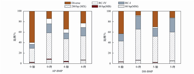 (3)兩批次實(shí)驗(yàn)前后T-RFLP分析結(jié)果與其生化產(chǎn)CH4勢(shì)相一致,實(shí)驗(yàn)結(jié)束后雜菌(Diverse)相對(duì)含量顯著下降,產(chǎn)甲烷髦毛菌Methanosaeta spp.(280 bps)、 產(chǎn)甲烷微菌 Methanomicrobiaceae(80 bps)和RC-I(389 bps)的相對(duì)含量皆有所提高,且DH-BMP樣品中產(chǎn)甲烷功能菌群相對(duì)含量提升程度高于AP-BMP.