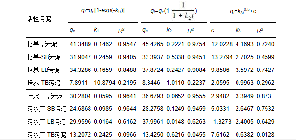 按動力學(xué)模型方程對吸附量-吸附時間進(jìn)行擬合,擬合結(jié)果如表 2所示.兩種污泥所有層的吸附與顆粒內(nèi)擴(kuò)散模型的吻合度均很低,尤其是-TB污泥,說明污泥對污染物的吸附在污泥絮體顆粒表面進(jìn)行,而沒有擴(kuò)散到絮體顆粒內(nèi)部.