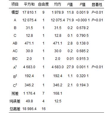 由表 3可知,本實(shí)驗(yàn)所選模型不同處理間差異顯著(模型的P<0.01),說(shuō)明回歸方程描述各因子與響應(yīng)值之間的關(guān)系時(shí),其應(yīng)變量與全體自變量之間的線性關(guān)系是顯著的,即這種實(shí)驗(yàn)方法是可靠的.