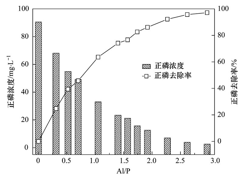 化學(xué)結(jié)晶法除磷具有效率高、 工藝簡(jiǎn)單、 運(yùn)行可靠的優(yōu)點(diǎn),在污水處理中得到了廣泛應(yīng)用[10, 11, 12].化學(xué)除磷一般通過(guò)Al3+、 Fe3+、 Ca2+或Mg2+與PO3-4形成沉淀將其去除,同時(shí)絮狀沉淀又能吸附去除部分正磷[13,14].化學(xué)除磷對(duì)于高含磷污水具有很好的處理效果. Triger等[15]研究了羥基磷灰石結(jié)晶去除厭氧上清液中磷的效果.張萌等[6,7]以響應(yīng)面法分析了Fe2+和Fe3+除磷過(guò)程主要操作條件Fe/P、 pH和快速攪拌轉(zhuǎn)速對(duì)富磷污水除磷的單獨(dú)效應(yīng)和聯(lián)合效應(yīng).磷酸銨鎂沉淀去除回收富磷污水中磷的研究也得到了廣泛關(guān)注[15, 16, 17].然而,作為污水處理廠水量較大且磷濃度較高的濃縮脫水污泥水,系統(tǒng)考察鋁鹽對(duì)其除磷效能及相關(guān)影響因素的研究卻鮮有報(bào)道.