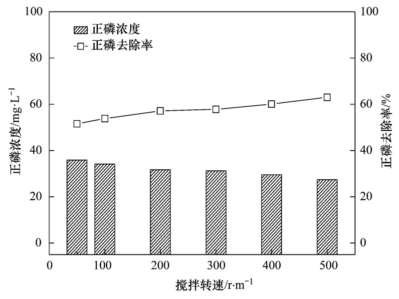 合適的MS可使PAC迅速擴(kuò)散到上清液中,溫度場(chǎng)和濃度場(chǎng)更均勻,促使Al3+與PO3-4接觸形成沉淀除磷,但是MS過(guò)大會(huì)打碎絮體,阻礙沉淀形成,降低正磷去除率.為確定合適的MS,分析了50~500 r ·min-1范圍內(nèi)污泥水上清液的PAC除磷效果,如圖 4所示.隨著MS增加,正磷去除率略有升高,但影響變化不大,去除率極差僅為11.5%.