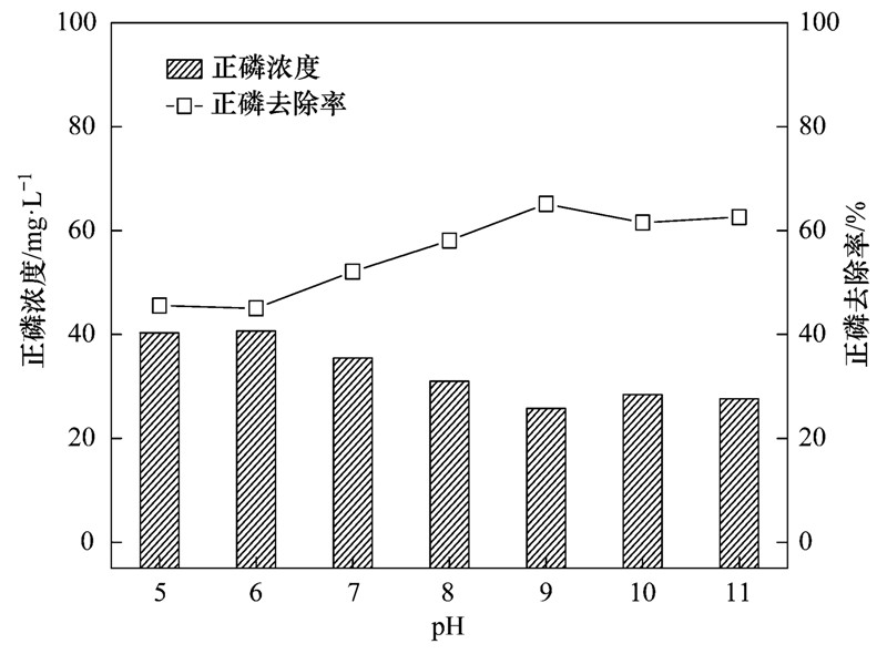 為了確定合適的pH范圍,分析了pH為5.0~11.0時(shí)污泥水上清液PAC除磷效果,如圖 3所示.當(dāng)pH<9.0時(shí),隨著pH升高,正磷去除率升高; 當(dāng)pH>9.0時(shí),進(jìn)一步提高pH,正磷去除率降低,但降低幅度很小.在pH<6.0和pH>10.0時(shí),pH對(duì)PAC混凝效果和磷酸鋁的溶解度影響不大.因此,pH為9.0時(shí)PAC對(duì)上清液的除磷效率最高,這可能與PAC在弱堿性條件下混凝效果最佳有關(guān)[24].