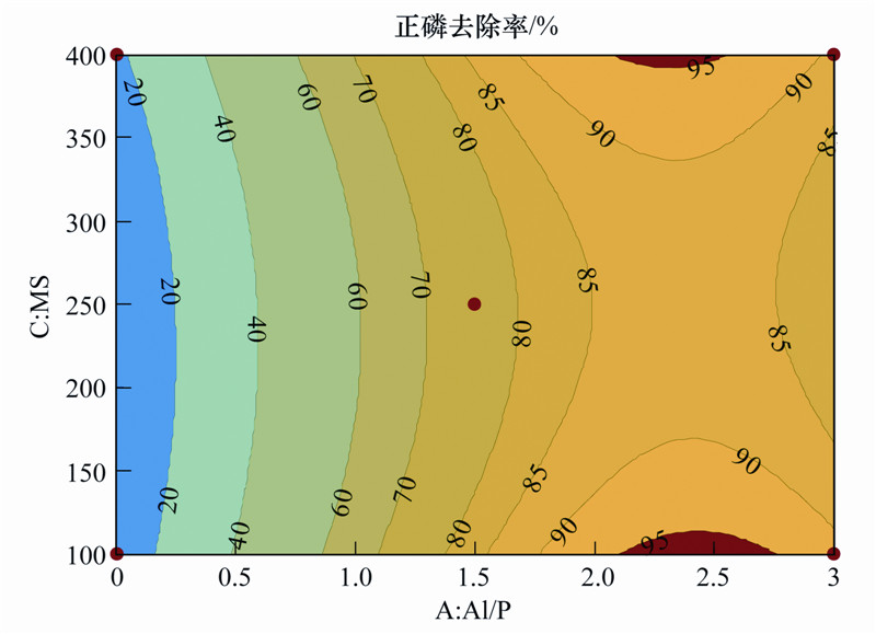 由圖 6可見(jiàn),在pH為7.5,Al/P比一定時(shí),隨MS增加,正磷去除率先減小后增大; 轉(zhuǎn)速一定時(shí),正磷去除率隨Al/P比增加先升后降.正磷去除率的變化速率顯示Al/P比主效應(yīng)大于MS,與統(tǒng)計(jì)結(jié)果相符.在圖 6中等高線右上、 下側(cè)區(qū)域,即Al/P比2.0~3.0,MS在100~150 r ·min-1和350~400r ·min-1時(shí),圖形顏色較深,表明污泥水正磷去除效果較好.