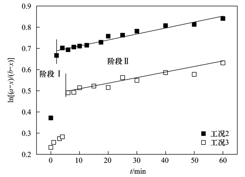 根據(jù)式(3)做表 4中工況2和3的動(dòng)力學(xué)曲線,如圖 8所示.從中可知,在反應(yīng)初始階段,正磷去除很快,這是因?yàn)镻AC加入污泥水中后,化學(xué)沉淀和混凝絮體的快速吸附造成正磷迅速降低[14, 25, 26].但絮體吸附很快飽和,工況2和3分別在2~4 min和4~6 min吸附飽和,此后主要通過(guò)式(1)的沉淀反應(yīng)去除正磷; 對(duì)后一階段用式(4)擬合,擬合結(jié)果如表 5所示.從中可知,擬合得到的可決系數(shù)R2均在0.90以上,這說(shuō)明Al3+與正磷的沉淀反應(yīng)符合二級(jí)動(dòng)力學(xué).工況2和3的二級(jí)動(dòng)力學(xué)常數(shù)kobs分別為3.89 d-1和3.46 d-1,工況2的pH在PAC混凝最佳pH范圍(6.5~7.6)內(nèi),而工況3的pH為5.0,生成的磷酸鋁又部分溶解.因此,工況2除磷效率更高,且kobs略高于工況3.具體參見(jiàn)污水寶商城資料或http://wlmqsb.com更多相關(guān)技術(shù)文檔。