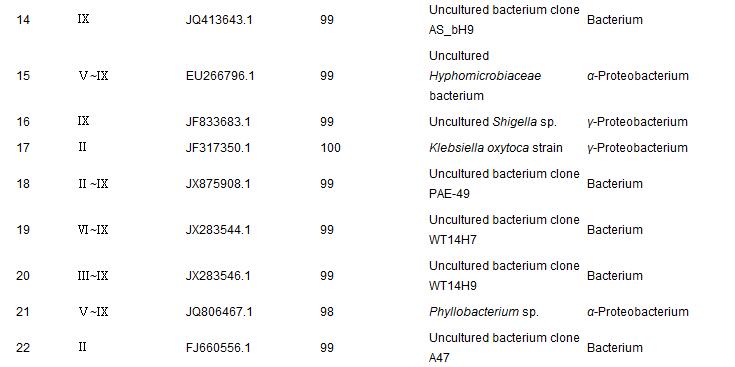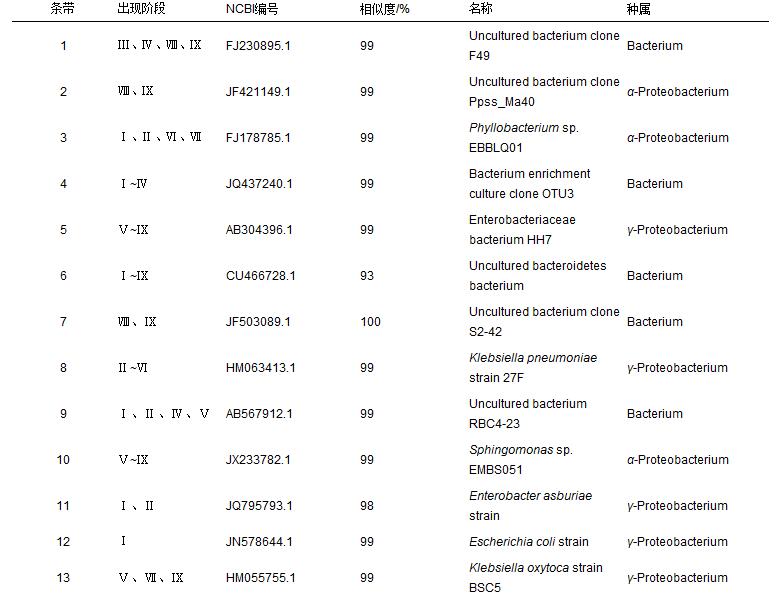 對(duì)DGGE指紋圖譜的條帶進(jìn)行回收測(cè)序分析,將測(cè)序結(jié)果與NCBI(National Center for Biotechnology Information,USA)數(shù)據(jù)庫中已知序列進(jìn)行比對(duì),確定各微生物的同源性及種屬,檢測(cè)到的微生物及其相關(guān)信息如表 3所示.經(jīng)比對(duì)鑒定,在SBMBR的9個(gè)污泥樣品中共檢測(cè)到22種微生物,其相似度大多在98%以上,其中屬于變形菌Proteobacterium的微生物有12種,分別屬于α綱(5種)和γ綱(7種),其余10種屬于未分類的Bacterium.