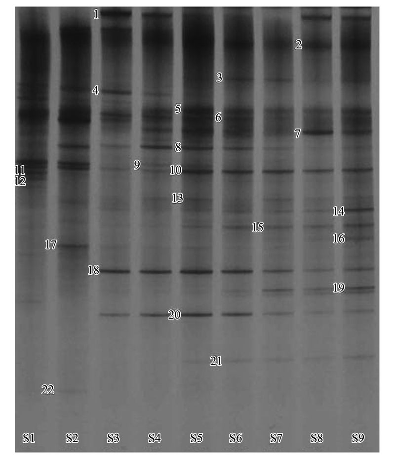 反應(yīng)器運(yùn)行各階段污泥樣品總細(xì)菌的DGGE指紋圖譜見圖 3.從中可以看出,在反應(yīng)器連續(xù)運(yùn)行的9個(gè)階段,各階段污泥樣品的電泳條帶數(shù)目、 條帶強(qiáng)度和條帶遷移速率均存在一定的差異,SBMBR系統(tǒng)中微生物種群呈現(xiàn)出較為明顯的演替變化.在反應(yīng)器運(yùn)行的初始階段(Ⅰ和Ⅱ),污泥的培養(yǎng)馴化還未完成,污泥樣品的條帶數(shù)目較少,說明微生物種群結(jié)構(gòu)較為簡(jiǎn)單.隨著實(shí)際廢水比例的不斷增加和污泥的馴化,污泥樣品的條帶數(shù)目開始逐漸增多,條帶分布也較為均勻,說明微生物種群組成開始變得更加豐富,反應(yīng)器的穩(wěn)定性也在不斷增強(qiáng).從S7開始,由于采用了實(shí)際丙烯腈廢水代替之前的模擬廢水,進(jìn)水水質(zhì)發(fā)生了明顯的變化,微生物種群結(jié)構(gòu)也發(fā)生了較為明顯的變化,部分菌種(如18和20)的條帶強(qiáng)度略有降低,并產(chǎn)生了一些新的條帶(如7、 14和19),說明不適應(yīng)進(jìn)水水質(zhì)的微生物群落優(yōu)勢(shì)度降低,降解實(shí)際廢水中污染物的新菌群逐步建立并形成為優(yōu)勢(shì)菌種.S9樣品泳道中條帶較為豐富、 均勻度較好,說明反應(yīng)器經(jīng)過一個(gè)階段的運(yùn)行后,微生物群落逐漸豐富并達(dá)到一個(gè)穩(wěn)定的狀態(tài).