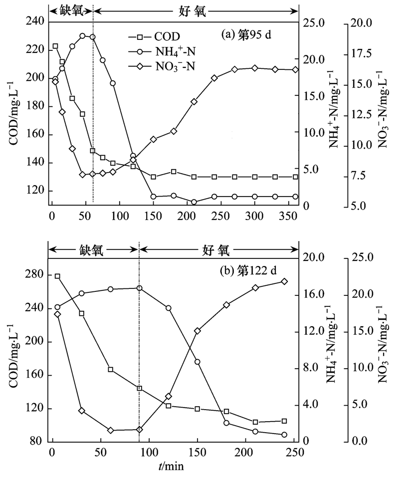 序批式生物反應(yīng)器通過間歇曝氣的方式在反應(yīng)器運(yùn)行中實(shí)現(xiàn)缺氧/好氧的交替循環(huán),最終通過硝化/反硝化過程實(shí)現(xiàn)有機(jī)物和氮的去除,因此,合理的運(yùn)行周期不僅可以提高生化系統(tǒng)的處理效果,還能降低能耗和運(yùn)行成本[23].在反應(yīng)器運(yùn)行的Ⅰ到Ⅶ階段,SBMBR的周期運(yùn)行方式為60 min缺氧/300 min好氧,該條件下單個(gè)運(yùn)行周期內(nèi)COD、 NH+4-N、 NO-3-N的變化如圖 2(a)所示,可以看出,COD的降解和NO-3-N的去除主要發(fā)生的缺氧攪拌期(0~60 min),這是因?yàn)樵谌毖鯒l件下,異養(yǎng)型的反硝化細(xì)菌以廢水中有機(jī)物為營養(yǎng)物質(zhì),通過反硝化過程實(shí)現(xiàn)N的去除[24].此外,在缺氧攪拌過程中,系統(tǒng)中NH+4-N的濃度逐漸升高,這主要是廢水中有機(jī)氮在微生物作用下向NH+4-N轉(zhuǎn)化導(dǎo)致的.在好氧階段(60~360 min),經(jīng)過約90 min的曝氣,NH+4-N濃度迅速降低至1.0 mg ·L-1左右,NO-3-N的濃度逐漸升高并在在曝氣210 min左右時(shí)基本達(dá)到最大并穩(wěn)定.為了提高反應(yīng)系統(tǒng)對(duì)污染物的降解能力,減少過度曝氣帶來的能耗損失,從第99 d開始,調(diào)整SBMBR的運(yùn)行周期為90 min缺氧/150 min好氧,由圖 2(b)可以看出,在該運(yùn)行條件下,COD和NH+4-N都能夠在最經(jīng)濟(jì)的條件下得到有效的去除,出水可以穩(wěn)定達(dá)標(biāo)排放.