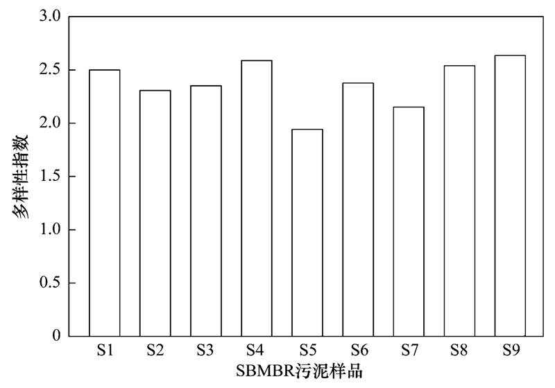 采用Shannon-wiener多樣性指數(shù)表征總細(xì)菌群落結(jié)構(gòu)多樣性,結(jié)果見圖 5.在S1~S4,隨著聚合廢水比例的逐漸增加,在廢水特征污染物的選擇作用下,一些不適應(yīng)聚合廢水的微生物生長處于劣勢(shì),微生物種群數(shù)量減少,生物多樣性指數(shù)略有下降,而隨著新的微生物種群結(jié)構(gòu)的建立和微生物對(duì)水質(zhì)和外部環(huán)境的逐漸適應(yīng),細(xì)菌種類和數(shù)量又開始增加,生物多樣性指數(shù)上升,在S4時(shí)達(dá)到了一個(gè)較高的水平.從S5開始,由于調(diào)整了進(jìn)水堿度和pH,微生物群落結(jié)構(gòu)受到外部環(huán)境變化影響,微生物多樣性指數(shù)出現(xiàn)小幅降低,而在之后的一段時(shí)間內(nèi)(S5~S9),反應(yīng)器pH值始終維持在7.5~8.5之間,進(jìn)水的水質(zhì)也基本趨于穩(wěn)定,微生物的生長條件比較適宜,新的微生物種群結(jié)構(gòu)逐漸建立,S9的微生物的多樣性指數(shù)達(dá)到了最大.