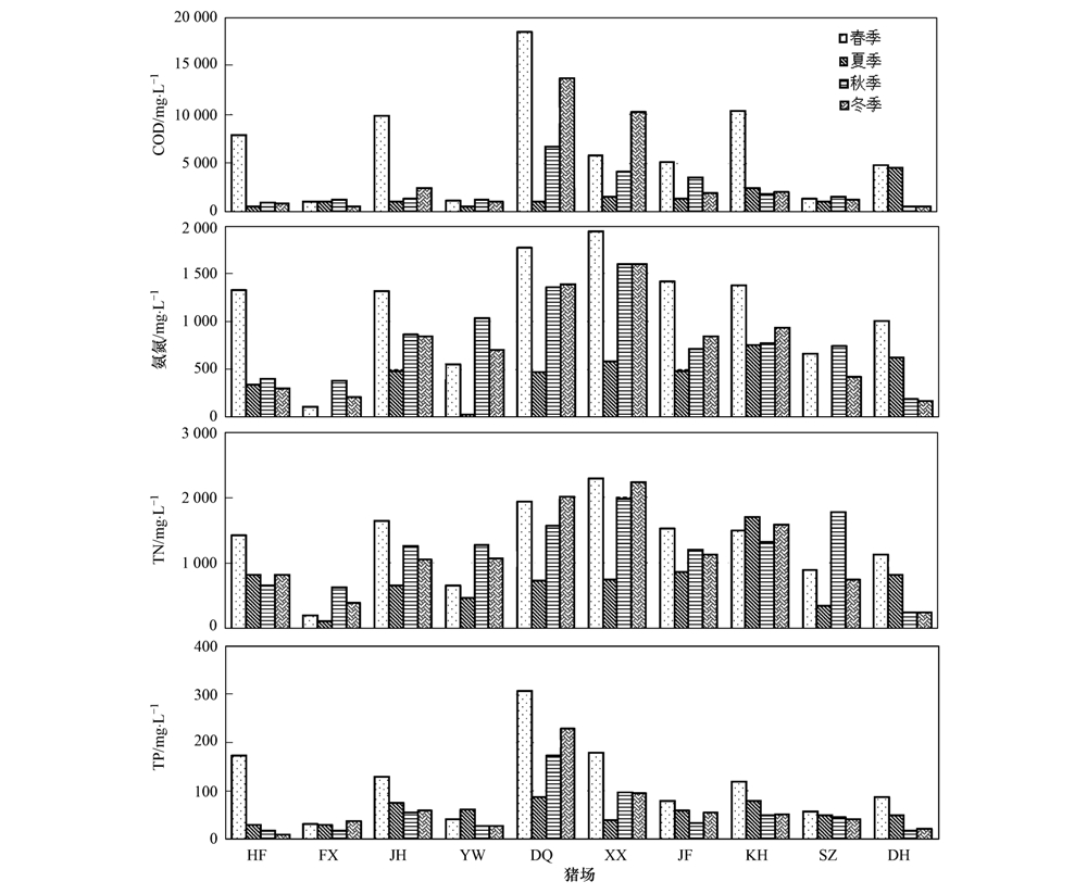 春季采樣組中,10家豬場沼液的COD濃度為1008~18479 mg ·L-1,DQ豬場濃度最高,FX豬場最低,二者相差了18倍. COD濃度小于2000 mg ·L-1以及在2000~6000 mg ·L-1之間的豬場各有3家,COD濃度高于6000 mg ·L-1的豬場有4家. TN濃度為205~2288 mg ·L-1,最大值與最小值相差了11倍; 氨氮濃度為119~1936 mg ·L-1,占TN濃度的84%±11%. 10家豬場中,有7家豬場的氨氮和TN濃度均在1000 mg ·L-1以上. TP濃度為32.6~306 mg ·L-1,其中TP濃度低于60 mg ·L-1和在60~150 mg ·L-1之間的各有3家,高于150 mg ·L-1的有4家.