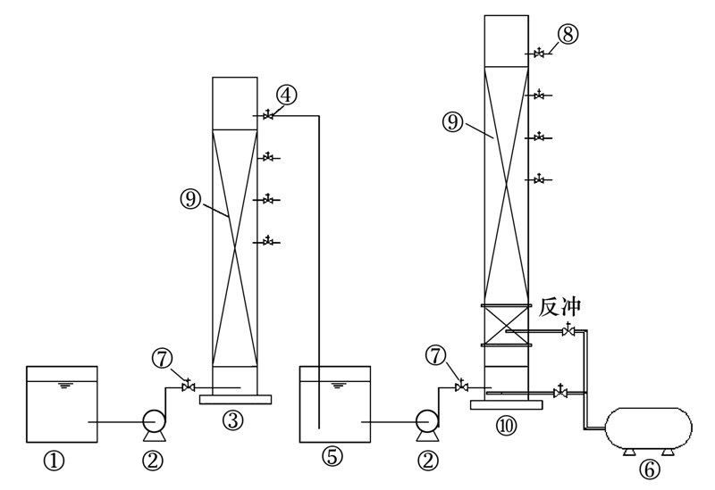 實驗工藝流程如圖 2所示. 實驗在室溫(25±2)℃下進行. AF柱高度2 200 mm,BAF柱高度2 500 mm,直徑200 mm,有機玻璃材質(zhì). 塔內(nèi)填料為多孔性、 高比表面積的陶粒,粒徑為3~4 mm,濾料高1 500 mm.