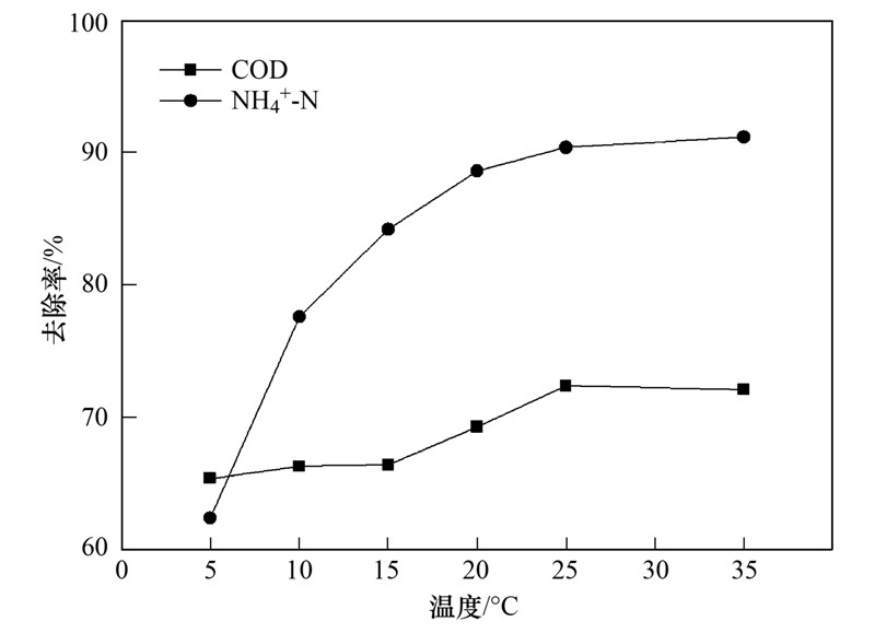 對于廢水的生物處理過程,溫度是一個非常重要的影響因素,它直接影響微生物的活性. 如圖 4所示,當溫度維持在25℃以上時,系統(tǒng)對COD的去除效率可保持在74%以上. 隨著溫度的降低,COD的去除效率雖有所下降,但下降幅度不大,當溫度下降至5℃時,COD的去除效率為65.4%. 由此可見,AF+BAF工藝對溫度的變化具有較強的適應能力,即使在冬季條件下運行,系統(tǒng)對COD的去除仍可保持較高的效率. 溫度變化對氨氮的影響較為明顯,當溫度從35℃下降至5℃時,氨氮的去除效率從91.2%下降至62.4%,這與硝化細菌在低溫下活性下降有關(guān).