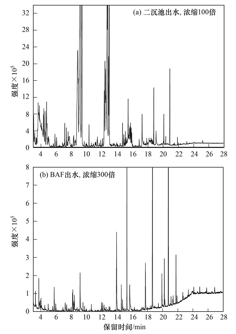 (2)化工園區(qū)廢水處理出水的GC-MS測試中檢測出大量有機物,經(jīng)AF+BAF處理后出水可檢測出的典型有機物種類大幅減少. 廢水中的大分子飽和烷烴和含氮雜環(huán)類物質(zhì)去除效率不佳.