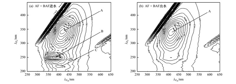 取二沉池尾水和AF+BAF的生化出水,稀釋5倍后進行三維熒光掃描,熒光峰類型與其他文獻的對比結(jié)果見表 4. 從圖 6可見,有機物降解效果明顯. 原水中可溶性微生物代謝產(chǎn)物(SMP)主要有3類:可見腐殖質(zhì)類A(λEx/λEm為340 nm/420 nm)、 類富里酸B(λEx/λEm為250 nm/380 nm)、 UV腐殖質(zhì)類C(λEx/λEm為220 nm/405 nm). 處理后其特征熒光基團熒光強度均有大幅下降,其中物質(zhì)B和物質(zhì)C的特征熒光峰完全消失,物質(zhì)A的特征熒光峰雖然存在,但其熒光強度由原來的595.15降低至464.08. 可見AF+BAF工藝對原水中的類富里酸和UV腐殖質(zhì)類可以完全去除,并能降解部分可見腐殖質(zhì)類物質(zhì).