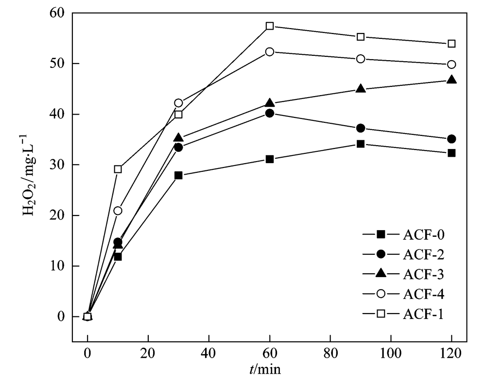 改性活性碳纖維的電催化活性通過改性前后過氧化氫產生量的變化予以說明,試驗結果如圖 2所示. 從中可以看出,以經微波、 硝酸和氨水改性的活性碳纖維為陰極時,H2O2的產生量均在反應進行60 min時達到最大,分別為57.4、 40.2和52.3 mg ·L-1,隨后逐漸減小; 未改性活性碳纖維的H2O2產生量在90 min達到最大值34.1 mg ·L-1; 經磷酸改性的活性碳纖維的H2O2產生量隨著反應時間的增加而增加,在120 min時達到46.7 mg ·L-1. 由此可見,在相同的反應時間里,H2O2的產生量依次是:ACF-1>ACF-4>ACF-3>ACF-2>ACF-0.以改性活性碳纖維為陰極時的H2O2產生量均高于以未改性活性碳纖維為陰極的,經微波改性的改性活性碳纖維的H2O2產生量約為未改性活性碳纖維的2倍. 這說明,無論是微波改性還是酸堿改性,都能在一定程度上提升活性碳纖維的電催化活性,且經微波改性的改性活性碳纖維電催化活性最優(yōu).