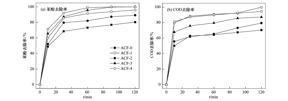 試驗除了考察改性對活性碳纖維電芬頓去除苯酚的影響以外,同時對苯酚廢水COD去除率進行了研究,結果如圖 3(b)所示. 不同反應體系中,COD去除率與苯酚去除率的趨勢相同,但反應相同時間,COD去除率均低于苯酚去除率,這說明,以活性碳纖維為陰極電芬頓處理苯酚,除部分苯酚被吸附直接去除外,還有一部分被氧化生成中間產物,由于中間產物的COD貢獻率,使得COD去除率低于苯酚去除率.
