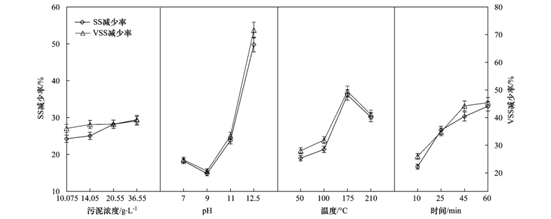 根據(jù)表 2中的試驗(yàn)結(jié)果,可以得到污泥SS、 VSS減少率隨4個(gè)因素的變化(圖 3). 從圖 3中可知,SS、 VSS減少率隨處理時(shí)間延長(zhǎng)和污泥濃度升高而升高,但隨污泥濃度的增加幅度小,這一變化規(guī)律與文獻(xiàn)一致[23]. 此外,SS、 VSS減少率隨溫度的升高呈先升高后降低的趨勢(shì),此趨勢(shì)與文獻(xiàn)[24]一致. 但是,SS、 VSS減少率卻隨pH的升高呈先降低后升高的趨勢(shì). 圖 3表明,在本試驗(yàn)條件下,4個(gè)因素對(duì)熱堿處理降低SS、 VSS的最佳組合條件為:污泥濃度36.55 g ·L-1、 pH 12.5、 溫度175℃和處理時(shí)間60 min. 對(duì)比單位污泥SCOD和污泥濃度(SS和VSS)的變化(表 2、 圖 1和圖 3)可知,4個(gè)因素對(duì)3個(gè)參數(shù)的影響相似,這主要是由于污泥SCOD的釋放來(lái)源于污泥絮體和微生物細(xì)胞的破裂、 融胞所釋放的有機(jī)物,有機(jī)物釋放會(huì)使一部分不溶性物質(zhì)轉(zhuǎn)化為溶解性物質(zhì),從而降低污泥濃度.