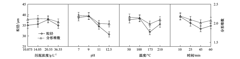熱堿處理能破壞污泥絮體結(jié)構(gòu),改變污泥表觀形態(tài),減小污泥粒徑,并提高污泥的ξ電位,從而影響污泥的形態(tài)特征[25]. 污泥形態(tài)特征可以用粒徑和分形維數(shù)表示. 分形維數(shù)是一個(gè)很重要的參數(shù),它影響了絮體的密度,分形維數(shù)的提高說(shuō)明污泥絮體由松散型向致密型過(guò)渡[26]. 采用激光粒度儀測(cè)定污泥粒徑,并根據(jù)光散射法計(jì)算污泥絮體的分形維數(shù),試驗(yàn)結(jié)果如表 2所示,其極差及方差分析見(jiàn)表 5. 從中可知,粒徑及分形維數(shù)的極差大小均為:pH>溫度>時(shí)間>污泥濃度. 結(jié)合方差分析結(jié)果可知,這4個(gè)因素對(duì)污泥粒徑的影響是顯著的,顯著性順序?yàn)椋簆H>溫度>時(shí)間>污泥濃度. 而只有pH值對(duì)分形維數(shù)的影響是顯著性的,其它3個(gè)因素均不顯著.