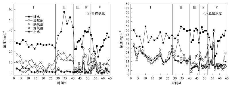 MLSS: 重量法[15],氨氮: 納氏試劑分光光度法[15],TN: 過硫酸鉀消解法[15],TP: 鉬銻抗分光光度法[15],VFA: 氣相色譜法[15],COD/SCOD: 快速消解分光光度法,DO: 在線溶氧儀,pH: pH測定儀(Mettler Toledo). 2 結(jié)果與討論 2.1 各階段氨氮和總氮的去除