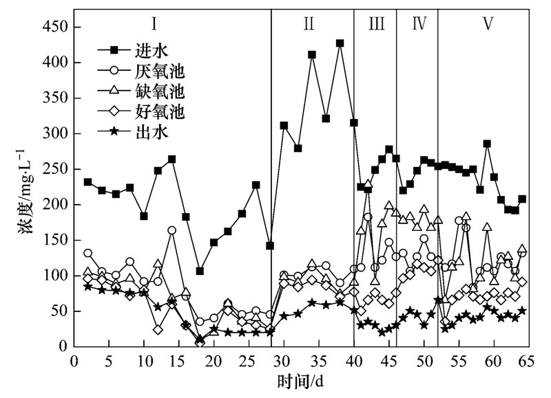 在階段Ⅰ的初始階段,反應(yīng)器處于適應(yīng)期,COD的去除效果不甚理想,未能達到的出水一級A排放標(biāo)準(COD≤50 mg ·L-1),在此之后,COD值均小于50 mg ·L-1. 在階段Ⅱ,雖然進水流量由10000 L ·d-1降低到5000 L ·d-1,但因進水COD高于前一階段,最高時達到411.28 mg ·L-1. 另外,從缺氧池COD濃度可以看出,由于外加碳源的輸入(25 mg ·L-1),COD有所升高. 由于本階段水溫較低,微生物活性降低,所以COD出水值一直在達標(biāo)線附近徘徊,效果不是很理想. 進入階段Ⅲ,進水COD略有下降,基本穩(wěn)定在250 mg ·L-1附近,同時可能由于氣溫升高的原因,盡管添加乙酸導(dǎo)致外加碳源輸入,但出水COD值保持在20-30 mg ·L-1之間. 階段Ⅳ將進水流量從5000 L ·d-1上升到7500 L ·d-1,在進水COD濃度和階段Ⅲ接近的條件下,出水COD值也全部達標(biāo),和階段Ⅲ相似,說明系統(tǒng)適應(yīng)后有一定的抗負荷能力.