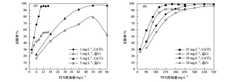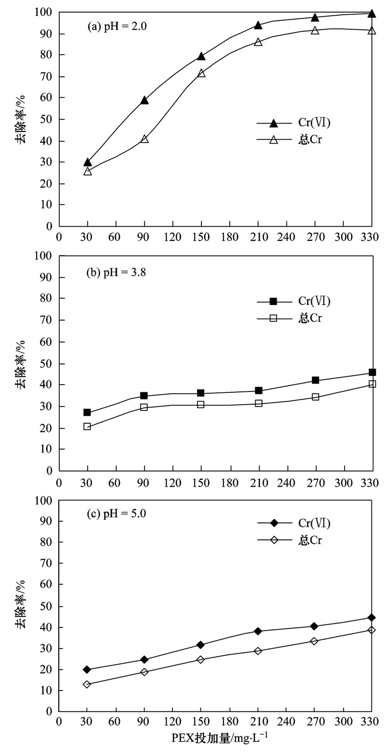 (2)pH值對PEX處理含鉻廢水影響較大,Cr(Ⅵ)和總Cr的去除率隨著體系中pH值的升高而明顯降低,在強酸條件下Cr(Ⅵ)和總Cr具有較高的去除效率.Cr(Ⅵ)和總Cr達(dá)到最高去除率時PEX投加量隨著Cr(Ⅵ)初始濃度的增加而增大,二者之間存在一定的化學(xué)計量關(guān)系.