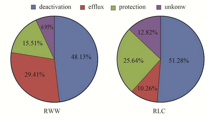 根據(jù)實(shí)驗(yàn)中使用的296對(duì)引物,按照基因?qū)?yīng)抗生素類型分為氨基糖苷類抗生素(Aminoglycoside)、 β-內(nèi)酰胺類抗生素(β-Lactamase)、氯霉素類抗生素(Chloramphenicol)、大環(huán)內(nèi)脂類-林肯酰胺類-鏈陽性菌素B類抗生素(MLSB)、磺胺類抗生素(Sulfonamide)、四環(huán)素類抗生素(Tetracycline)、萬古霉素類抗生素(Vancomycin)和其他類或者發(fā)揮外排泵作用(other/efflux)這8類抗生素抗性基因.城市生活污水(RWW)檢測(cè)出187抗生素抗性基因,垃圾滲濾液檢測(cè)出39中抗生素抗性基因(圖 1).其中,城市生活污水檢測(cè)到的抗生素抗性基因涵蓋了以上全部8類抗生素類型,而垃圾滲濾液檢測(cè)到的抗性基因類型只含有氨基糖苷類抗生素(Aminoglycoside)、大環(huán)內(nèi)脂類-林肯酰胺類-鏈陽性菌素B類抗生素(MLSB)、四環(huán)素類抗生素(Tetracycline)和其它類或者發(fā)揮外排泵作用(other/efflux)這4類抗生素抗性類型.有研究表明,垃圾滲濾液中四環(huán)素類抗生素類型在中國(guó)6個(gè)不同地理位置的垃圾填埋場(chǎng)滲濾液中被有效檢出[25, 26],與本研究結(jié)果一致.此外,垃圾滲濾液檢測(cè)到的4類抗生素抗性類型中的抗性基因數(shù)目均小于生活污水中的對(duì)應(yīng)類型抗性基因數(shù)目.抗生素抗性基因按照抗性機(jī)制可以分成抗生素失活(deactivation)、外排泵作用機(jī)制(efflux)、核糖體保護(hù)機(jī)制(protection)和未知抗性機(jī)制(unkown)四大類.將檢測(cè)到的抗生素抗性基因從抗生素抗性機(jī)制歸類分析,抗生素失活(deactivation)是兩種污水微生物抗生素抗性最主要機(jī)制,比例分別為48.13%和51.28%(圖 2).垃圾滲濾液檢測(cè)到的39種抗生素抗性基因中只有erm(35)基因僅在垃圾滲濾液中檢出,其余38種抗性基因在城市生活污水同時(shí)被有效檢出.總體結(jié)果表明,城市生活污水和垃圾滲濾液檢測(cè)到的抗生素抗性種類有顯著差異(P < 0.05).