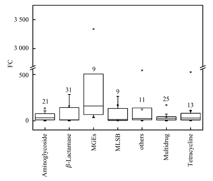城市生活污水氮磷等營(yíng)養(yǎng)元素豐富,相對(duì)于垃圾滲濾液其有毒有害物質(zhì)濃度較低,微生物數(shù)量多,世代更新快,并且微生物種類繁多等特性,兩者合并處理有一定優(yōu)勢(shì)[13].城市生活污水檢出富集的抗性基因總共有7大類,其中119種抗生素抗性基因和可移動(dòng)元件顯著增加(P < 0.05),富集倍數(shù)前三的基因是轉(zhuǎn)座子tnpA-04基因、 blaVEB和blaOXA10-01,分別達(dá)到了3 338、 1 061和1 001倍(圖 6),表明轉(zhuǎn)座子基因和β-內(nèi)酰胺類抗生素抗性基因在城市生活污水中顯著富集.環(huán)境抗生素抗性基因在微生物中存在著水平基因轉(zhuǎn)移機(jī)制(horizontal gene transfer,HGT),可移動(dòng)元件(MGEs)與總抗生素抗性存在線性相關(guān)[7],可能是污水廠的進(jìn)水普遍有較高的檢出率和富集現(xiàn)象的原因之一.抗生素殘留和重金屬離子對(duì)抗生素抗性具有共選擇或者誘導(dǎo)作用,導(dǎo)致了特定類型的抗生素抗性基因的出現(xiàn)和富集[10, 29].城市生活污水和垃圾滲濾液都是人類生產(chǎn)生活末端的“副產(chǎn)物”,含有一定量的抗生素殘留和重金屬離子,在分子機(jī)制上進(jìn)一步研究它們與抗生素抗性基因的關(guān)系,分析抗性基因在環(huán)境物質(zhì)脅迫下的演變傳播顯得十分必要.